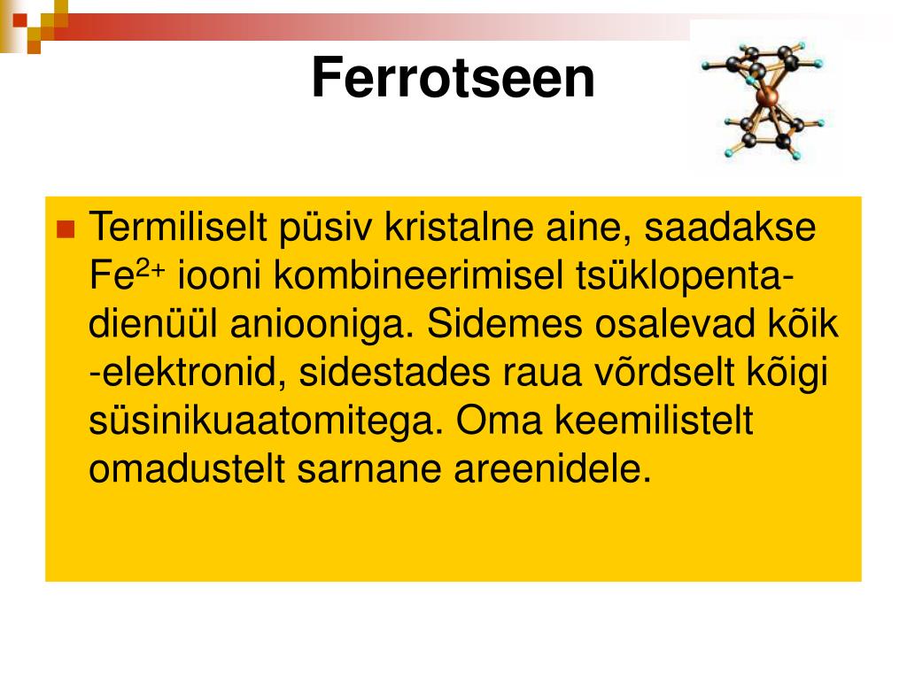 Ferrotseen • Termiliselt püsiv kristalne aine, saadakse Fe2+ iooni kombineerimisel tsüklopenta-dienüül aniooniga. Sidemes osalevad kõik -elektronid, sidestades raua võrdselt kõigi süsinikuaatomitega. Oma keemilistelt omadustelt sarnane areenidele.