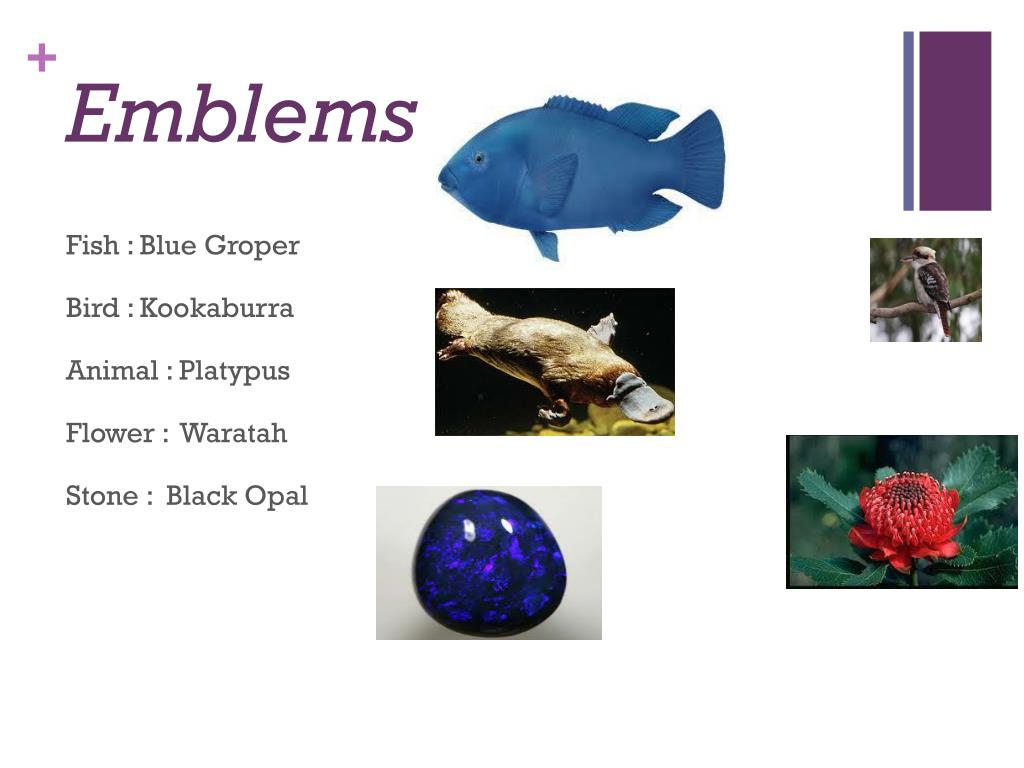 Emblems Fish : Blue Groper Bird : Kookaburra Animal : Platypus Flower : Waratah Stone : Black Opal