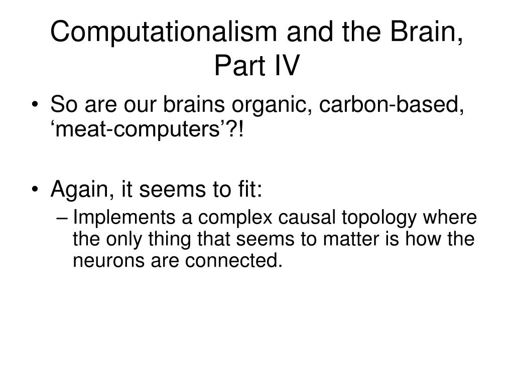Computationalism and the Brain, Part IV • So are our brains organic, carbon-based, ‘meat-computers’?! • Again, it seems to fit: • Implements a complex causal topology where the only thing that seems to matter is how the neurons are connected.