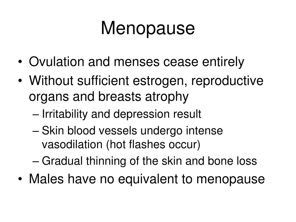 Menopause • Ovulation and menses cease entirely • Without sufficient estrogen, reproductive organs and breasts atrophy • Irritability and depression result • Skin blood vessels undergo intense vasodilation (hot flashes occur) • Gradual thinning of the skin and bone loss • Males have no equivalent to menopause
