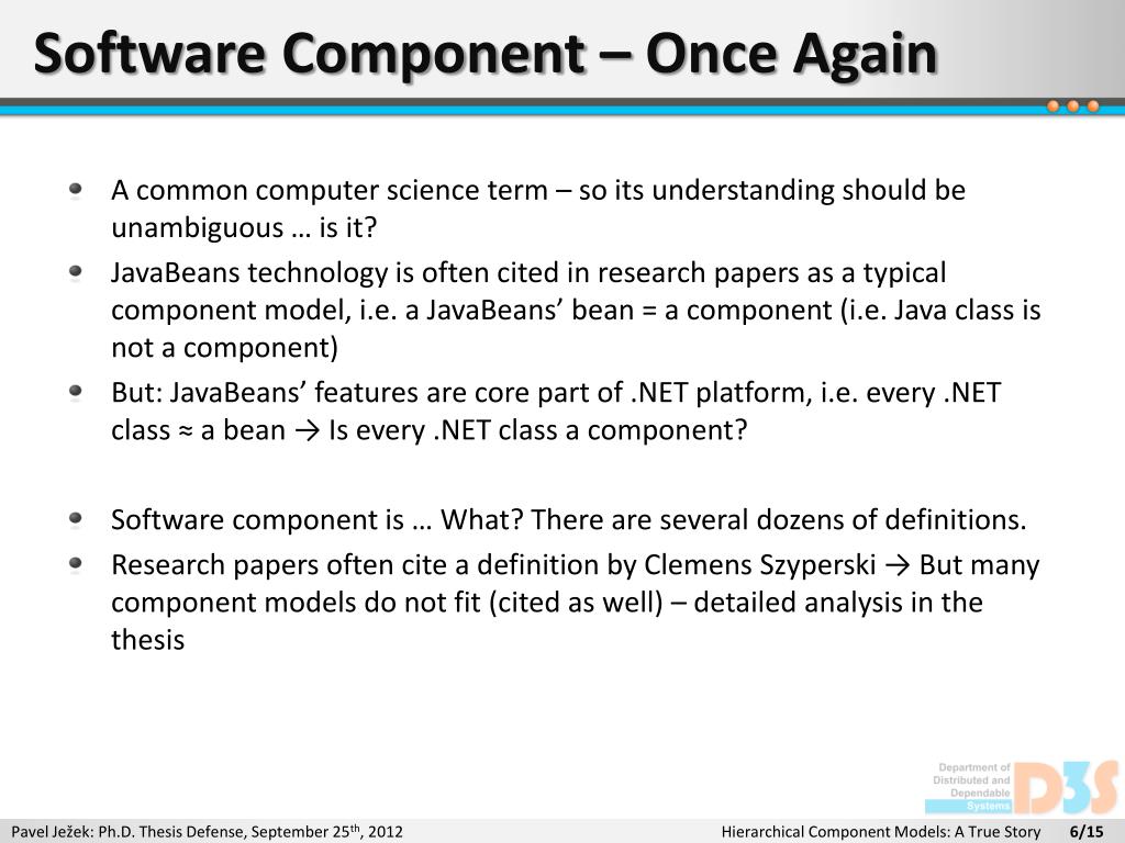 Software Component – Once Again • A common computer science term – so its understanding should be unambiguous … is it? • JavaBeans technology is often cited in research papers as a typical component model, i.e. a JavaBeans’ bean = a component (i.e. Java class is not a component) • But: JavaBeans’ features are core part of .NET platform, i.e. every .NET class ≈ a bean → Is every .NET class a component? • Software component is … What? There are several dozens of definitions. • Research papers often cite a definition by Clemens Szyperski → But many component models do not fit (cited as well) – detailed analysis in the thesis