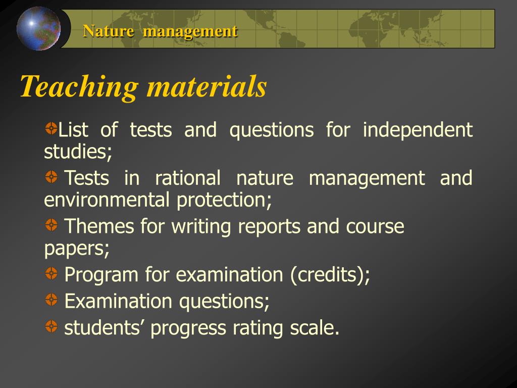 Nature management Teaching materials • List of tests and questions for independent studies; • Tests in rational nature management and environmental protection; • Themes for writing reports and course papers; • Program for examination (credits); • Examination questions; • students’ progress rating scale.