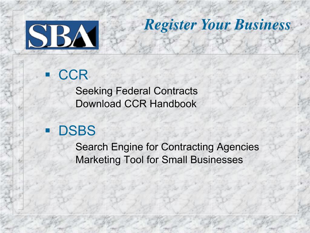 Register Your Business • CCR Seeking Federal Contracts Download CCR Handbook • DSBS Search Engine for Contracting Agencies Marketing Tool for Small Businesses