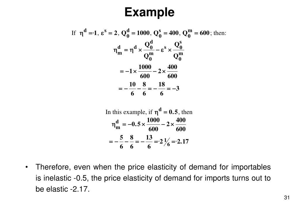 Example - – – • Therefore, even when the price elasticity of demand for importables is inelastic -0.5, the price elasticity of demand for imports turns out to be elastic -2.17.