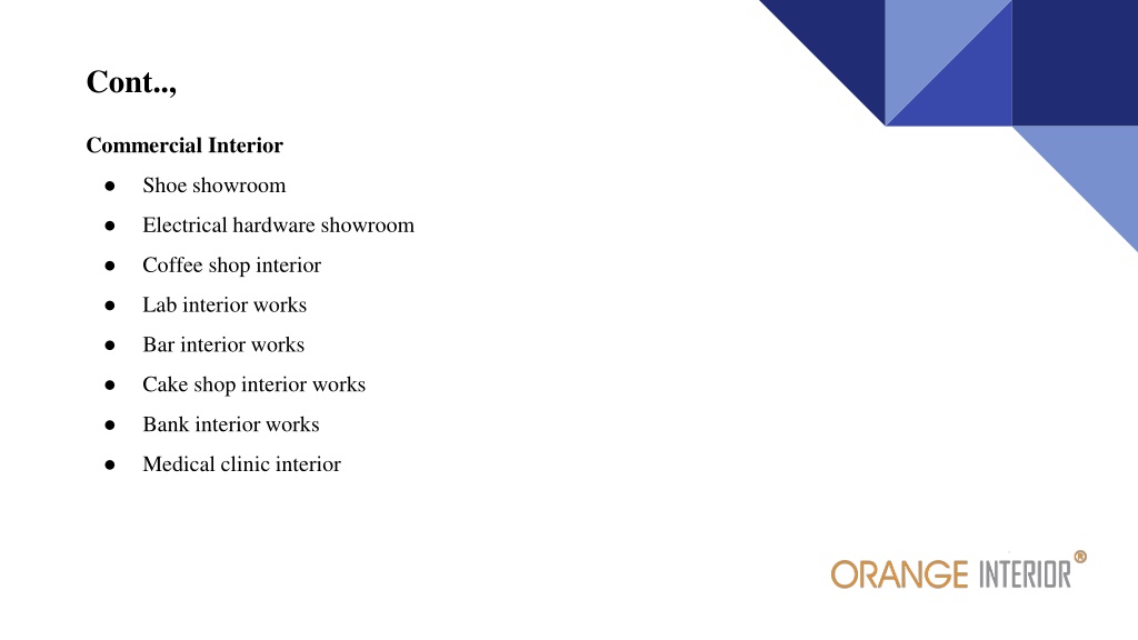 Cont.., Commercial Interior Shoe showroom Electrical hardware showroom Coffee shop interior Lab interior works Bar interior works Cake shop interior works Bank interior works Medical clinic interior