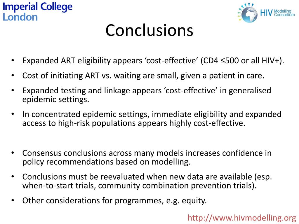 Conclusions • Expanded ART eligibility appears ‘cost-effective’ (CD4 ≤500 or all HIV+). • Cost of initiating ART vs. waiting are small, given a patient in care. • Expanded testing and linkage appears ‘cost-effective’ in generalised epidemic settings. • In concentrated epidemic settings, immediate eligibility and expanded access to high-risk populations appears highly cost-effective. • Consensus conclusions across many models increases confidence in policy recommendations based on modelling. • Conclusions must be reevaluated when new data are available (esp. when-to-start trials, community combination prevention trials). • Other considerations for programmes, e.g. equity. http://www.hivmodelling.org