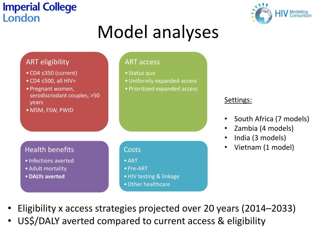 Model analyses • Settings: • South Africa (7 models) • Zambia (4 models) • India (3 models) • Vietnam (1 model) • Eligibility x access strategies projected over 20 years (2014–2033) • US$/DALY averted compared to current access & eligibility