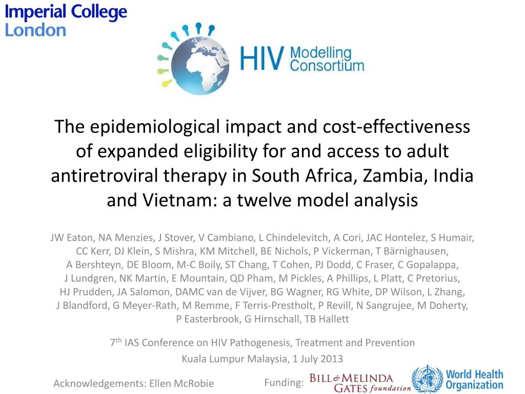 The epidemiological impact and cost-effectiveness of expanded eligibility for and access to adult antiretroviral therapy in South Africa, Zambia, India and Vietnam: a twelve model analysis JW Eaton, NA Menzies, J Stover, V Cambiano, L Chindelevitch, A Cori, JAC Hontelez, S Humair, CC Kerr, DJ Klein, S Mishra, KM Mitchell, BE Nichols, P Vickerman, T Bärnighausen, A Bershteyn, DE Bloom, M-C Boily, ST Chang, T Cohen, PJ Dodd, C Fraser, C Gopalappa, J Lundgren, NK Martin, E Mountain, QD Pham, M Pickles, A Phillips, L Platt, C Pretorius, HJ Prudden, JA Salomon, DAMC van de Vijver, BG Wagner, RG White, DP Wilson, L Zhang, J Blandford, G Meyer-Rath, M Remme, F Terris-Prestholt, P Revill, N Sangrujee, M Doherty, P Easterbrook, G Hirnschall, TB Hallett 7th IAS Conference on HIV Pathogenesis, Treatment and Prevention Kuala Lumpur Malaysia, 1 July 2013 Funding: Acknowledgements: Ellen McRobie