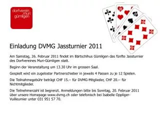 Einladung DVMG Jassturnier 2011. Am Samstag, 26. Februar 2011 findet im Bärtschihus Gümligen das fünfte Jassturnier des Dorfvereines Muri-Gümligen statt. Beginn der Veranstaltung um 13.30 Uhr im grossen Saal. Gespielt wird ein zugeloster Partnerschieber in jeweils 4 Passen zu je 12 Spielen.