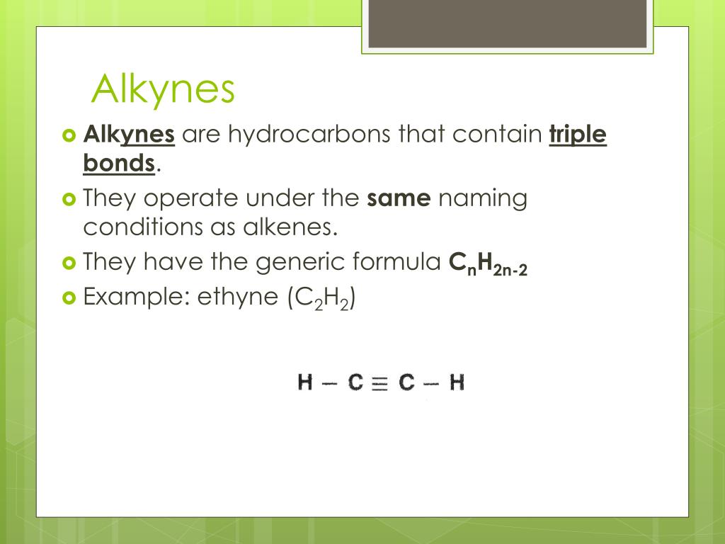 Alkynes • Alkynes are hydrocarbons that contain triple bonds. • They operate under the same naming conditions as alkenes. • They have the generic formula CnH2n-2 • Example: ethyne (C2H2)