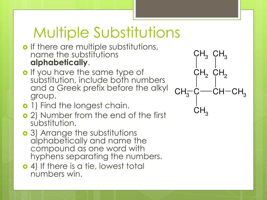 Multiple Substitutions • If there are multiple substitutions, name the substitutions alphabetically. • If you have the same type of substitution, include both numbers and a Greek prefix before the alkyl group. • 1) Find the longest chain. • 2) Number from the end of the first substitution. • 3) Arrange the substitutions alphabetically and name the compound as one word with hyphens separating the numbers. • 4) If there is a tie, lowest total numbers win.