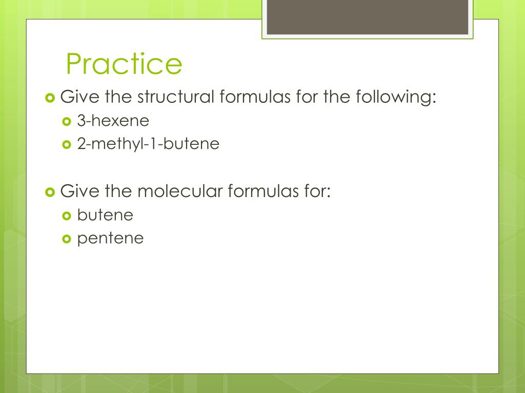Practice • Give the structural formulas for the following: • 3-hexene • 2-methyl-1-butene • Give the molecular formulas for: • butene • pentene