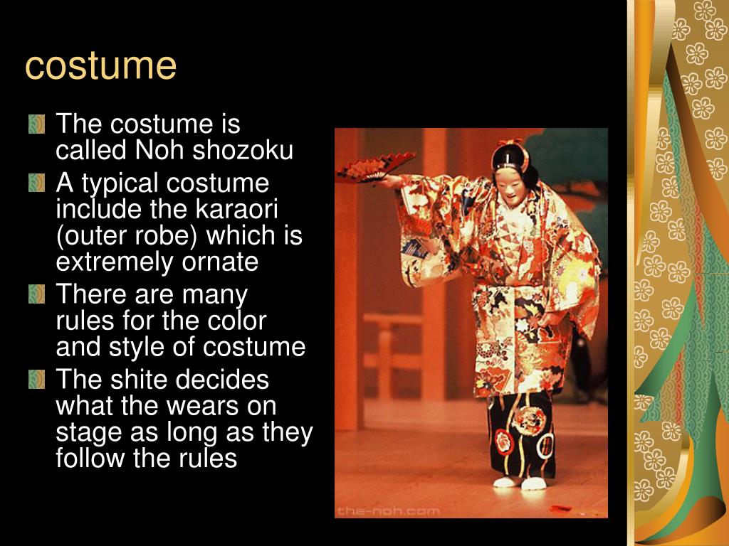 costume • The costume is called Noh shozoku • A typical costume include the karaori (outer robe) which is extremely ornate • There are many rules for the color and style of costume • The shite decides what the wears on stage as long as they follow the rules
