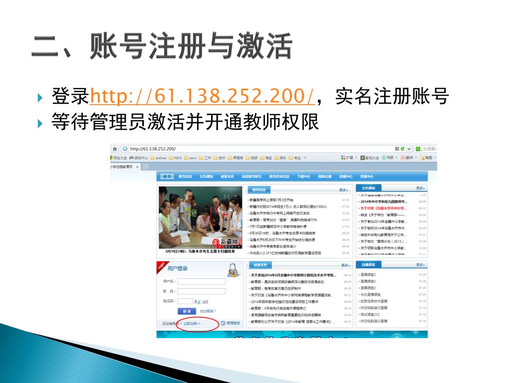 二、账号注册与激活 • 登录http://61.138.252.200/,实名注册账号 • 等待管理员激活并开通教师权限