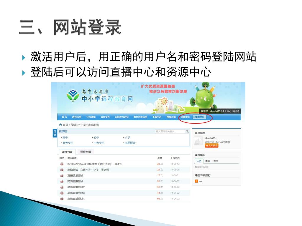 三、网站登录 • 激活用户后,用正确的用户名和密码登陆网站 • 登陆后可以访问直播中心和资源中心
