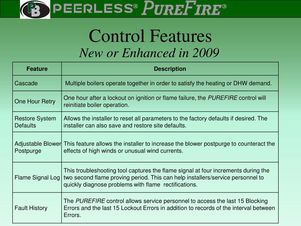 New Control Features Cascade Firing of Multiple Boilers • Control up to16 Boilers in One System • No Extra Controls Required, Only 1 System Sensor • Automatic Rotation of Boilers (Lead/Lag) • No Extensive Programming Required - Most Options Are Pre-Selected, But Adjustable • Boilers will be Fired Proportionally with Timed Start and Stop for Maximum Efficiency & Longevity • All PureFire™ Boilers will be Cascade Capable - After the Release of the new PF-210 & PF-399 - Existing PF Boilers Can Be Easily Upgraded • New Controls will be Compatible with Older Displays & Vice Versa
