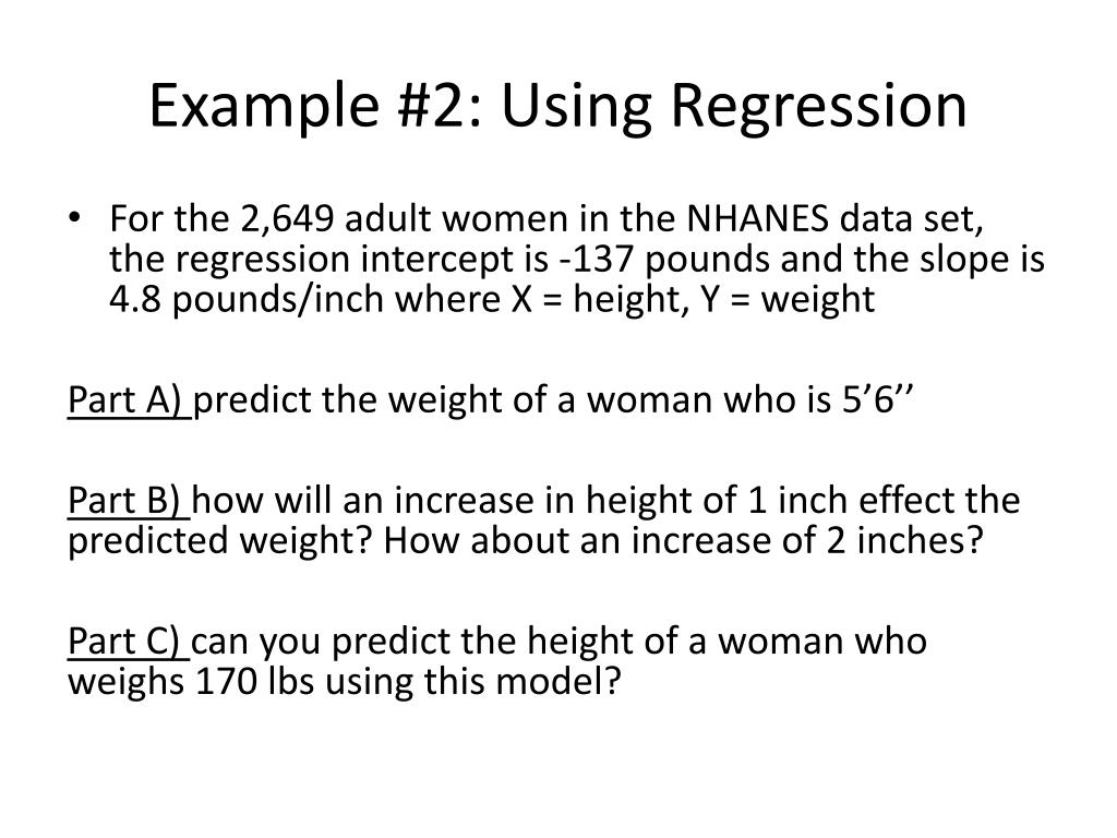 Example #2: Using Regression • For the 2,649 adult women in the NHANES data set, the regression intercept is -137 pounds and the slope is 4.8 pounds/inch where X = height, Y = weight Part A) predict the weight of a woman who is 5’6’’ Part B) how will an increase in height of 1 inch effect the predicted weight? How about an increase of 2 inches? Part C) can you predict the height of a woman who weighs 170 lbs using this model?