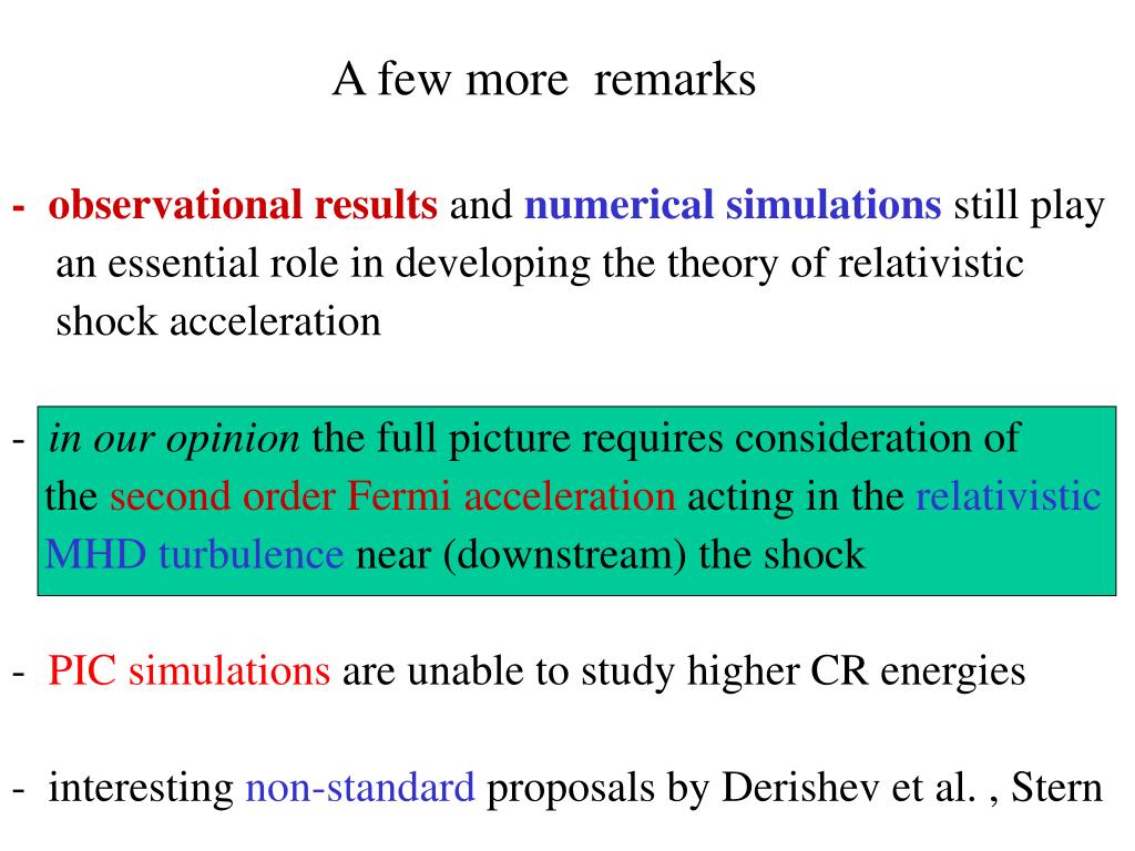 A few more remarks - observational results and numerical simulations still play an essential role in developing the theory of relativistic shock acceleration - in our opinion the full picture requires consideration of the second order Fermi acceleration acting in the relativistic MHD turbulence near (downstream) the shock - PIC simulations are unable to study higher CR energies - interesting non-standard proposals by Derishev et al. , Stern