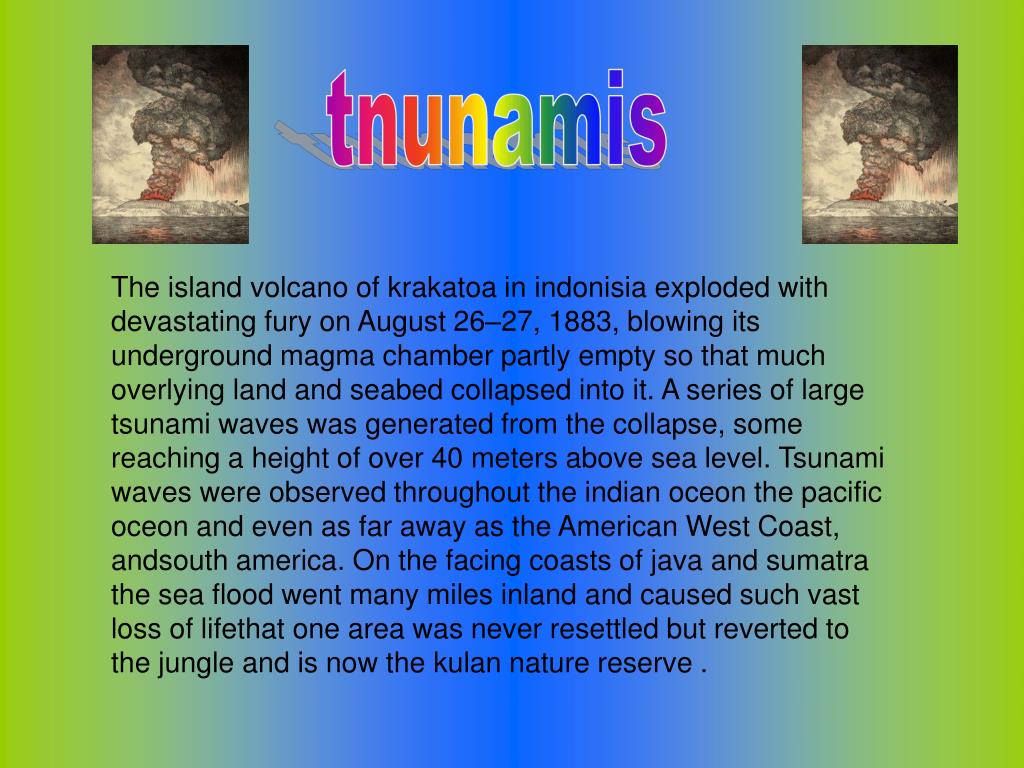 tnunamis The island volcano of krakatoa in indonisia exploded with devastating fury on August 26–27, 1883, blowing its underground magma chamber partly empty so that much overlying land and seabed collapsed into it. A series of large tsunami waves was generated from the collapse, some reaching a height of over 40 meters above sea level. Tsunami waves were observed throughout the indian oceon the pacific oceon and even as far away as the American West Coast, andsouth america. On the facing coasts of java and sumatra the sea flood went many miles inland and caused such vast loss of lifethat one area was never resettled but reverted to the jungle and is now the kulan nature reserve .