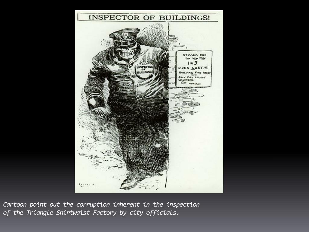 Cartoon point out the corruption inherent in the inspection of the Triangle Shirtwaist Factory by city officials.