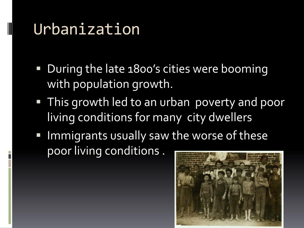 Urbanization • During the late 1800’s cities were booming with population growth. • This growth led to an urban poverty and poor living conditions for many city dwellers • Immigrants usually saw the worse of these poor living conditions .