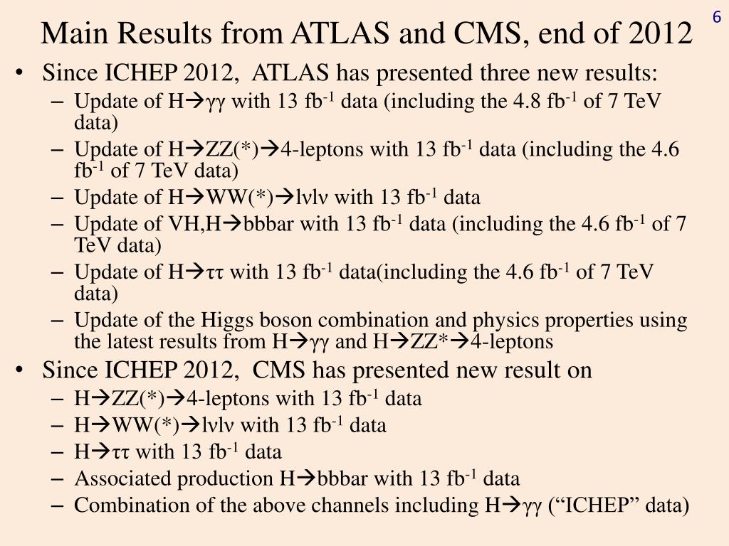 Main Results from ATLAS and CMS, end of 2012 • Since ICHEP 2012, ATLAS has presented three new results: • Update of Hγγ with 13 fb-1 data (including the 4.8 fb-1 of 7 TeV data) • Update of HZZ(*)4-leptons with 13 fb-1 data (including the 4.6 fb-1 of 7 TeV data) • Update of HWW(*)lνlνwith 13 fb-1 data • Update of VH,Hbbbar with 13 fb-1 data (including the 4.6 fb-1 of 7 TeV data) • Update of Hττ with 13 fb-1data(including the 4.6 fb-1 of 7 TeV data) • Update of the Higgs boson combination and physics properties using the latest results from Hγγ and HZZ*4-leptons • Since ICHEP 2012, CMS has presented new result on • HZZ(*)4-leptons with 13 fb-1 data • HWW(*)lνlν with 13 fb-1 data • Hττ with 13 fb-1 data • Associated production Hbbbar with 13 fb-1 data • Combination of the above channels including Hγγ (“ICHEP” data)