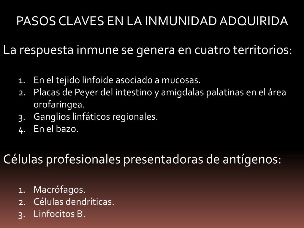 PASOS CLAVES EN LA INMUNIDAD ADQUIRIDA • La respuesta inmune se genera en cuatro territorios: • En el tejido linfoide asociado a mucosas. • Placas de Peyer del intestino y amigdalas palatinas en el área orofaringea. • Ganglios linfáticos regionales. • En el bazo. • Células profesionales presentadoras de antígenos: • Macrófagos. • Células dendríticas. • Linfocitos B.