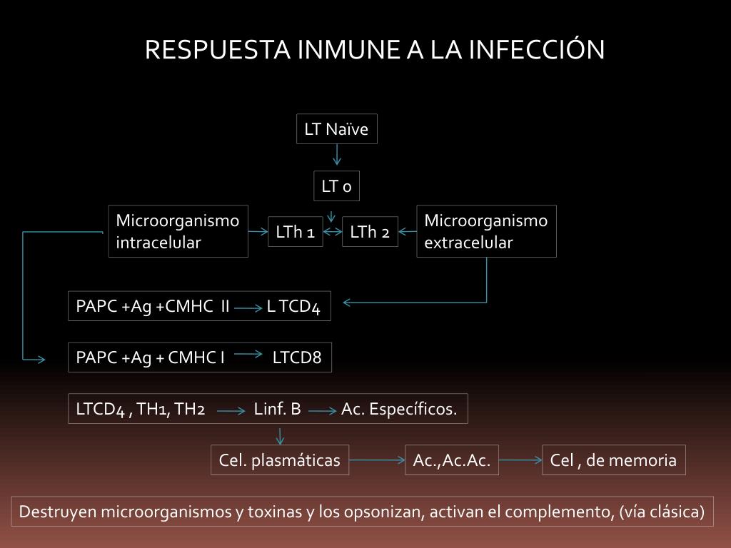 RESPUESTA INMUNE A LA INFECCIÓN LT Naïve LT 0 Microorganismo intracelular Microorganismo extracelular LTh 1 LTh 2 PAPC +Ag +CMHC II L TCD4 PAPC +Ag + CMHC I LTCD8 LTCD4 , TH1, TH2 Linf. B Ac. Específicos. Cel. plasmáticas Ac.,Ac.Ac. Cel , de memoria Destruyen microorganismos y toxinas y los opsonizan, activan el complemento, (vía clásica)