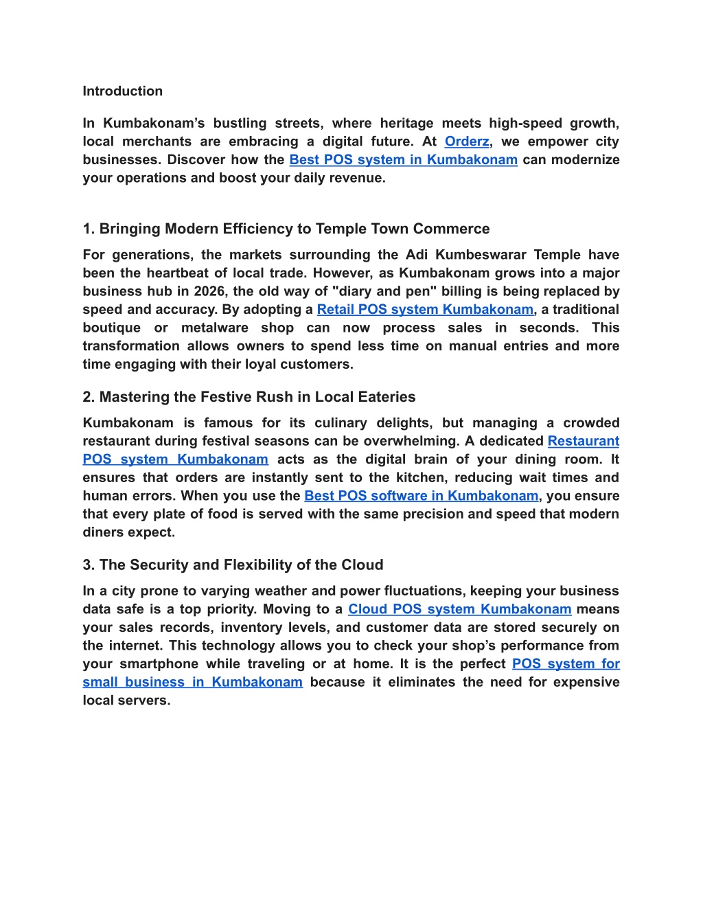 Introduction In Kumbakonam’s bustling streets, where heritage meets high-speed growth, local merchants are embracing a digital future. At Orderz, we empower city businesses. Discover how the Best POS system in Kumbakonam can modernize your operations and boost your daily revenue. 1. Bringing Modern Efficiency to Temple Town Commerce For generations, the markets surrounding the Adi Kumbeswarar Temple have been the heartbeat of local trade. However, as Kumbakonam grows into a major business hub in 2026, the old way of "diary and pen" billing is being replaced by speed and accuracy. By adopting a Retail POS system Kumbakonam, a traditional boutique or metalware shop can now process sales in seconds. This transformation allows owners to spend less time on manual entries and more time engaging with their loyal customers. 2. Mastering the Festive Rush in Local Eateries Kumbakonam is famous for its culinary delights, but managing a crowded restaurant during festival seasons can be overwhelming. A dedicated Restaurant POS system Kumbakonam acts as the digital brain of your dining room. It ensures that orders are instantly sent to the kitchen, reducing wait times and human errors. When you use the Best POS software in Kumbakonam, you ensure that every plate of food is served with the same precision and speed that modern diners expect. 3. The Security and Flexibility of the Cloud In a city prone to varying weather and power fluctuations, keeping your business data safe is a top priority. Moving to a Cloud POS system Kumbakonam means your sales records, inventory levels, and customer data are stored securely on the internet. This technology allows you to check your shop’s performance from your smartphone while traveling or at home. It is the perfect POS system for small business in Kumbakonam because it eliminates the need for expensive local servers.