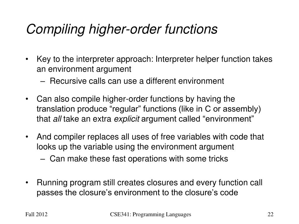 Compiling higher-order functions • Key to the interpreter approach: Interpreter helper function takes an environment argument • Recursive calls can use a different environment • Can also compile higher-order functions by having the translation produce “regular” functions (like in C or assembly) that all take an extra explicit argument called “environment” • And compiler replaces all uses of free variables with code that looks up the variable using the environment argument • Can make these fast operations with some tricks • Running program still creates closures and every function call passes the closure’s environment to the closure’s code CSE341: Programming Languages
