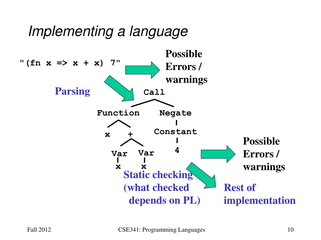 Implementing a language Possible Errors / warnings "(fn x => x + x) 7" Parsing Call Function Negate Constant x + Possible Errors / warnings 4 Var Var x x Static checking (what checked depends on PL) Rest of implementation CSE341: Programming Languages