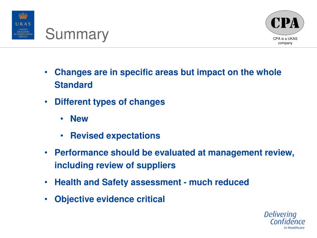 Summary • Changes are in specific areas but impact on the whole Standard • Different types of changes • New • Revised expectations • Performance should be evaluated at management review, including review of suppliers • Health and Safety assessment - much reduced • Objective evidence critical