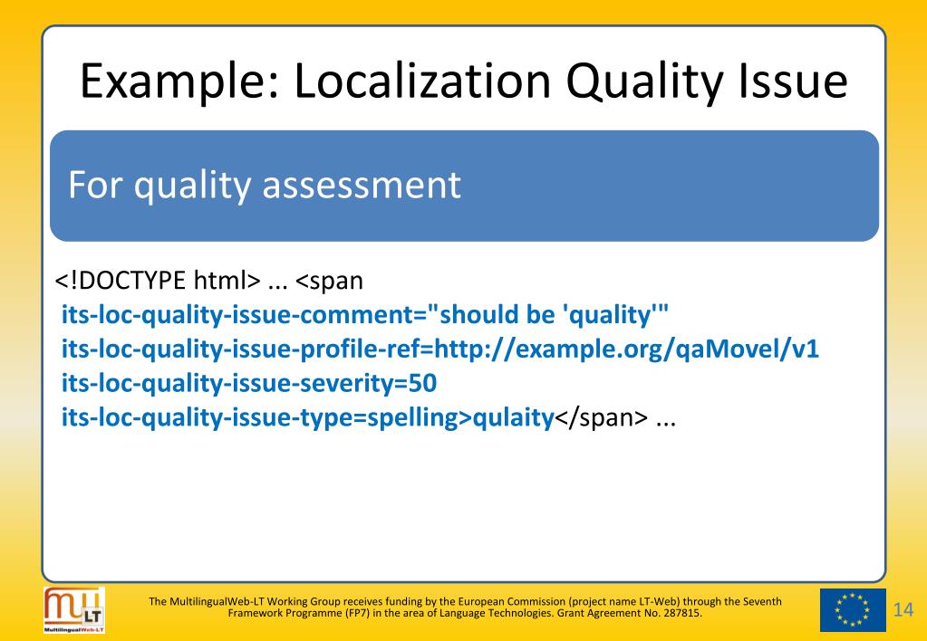 Example: Localization Quality Issue <!DOCTYPE html> ... <span its-loc-quality-issue-comment="shouldbe 'quality'" its-loc-quality-issue-profile-ref=http://example.org/qaMovel/v1 its-loc-quality-issue-severity=50 its-loc-quality-issue-type=spelling>qulaity</span> ...
