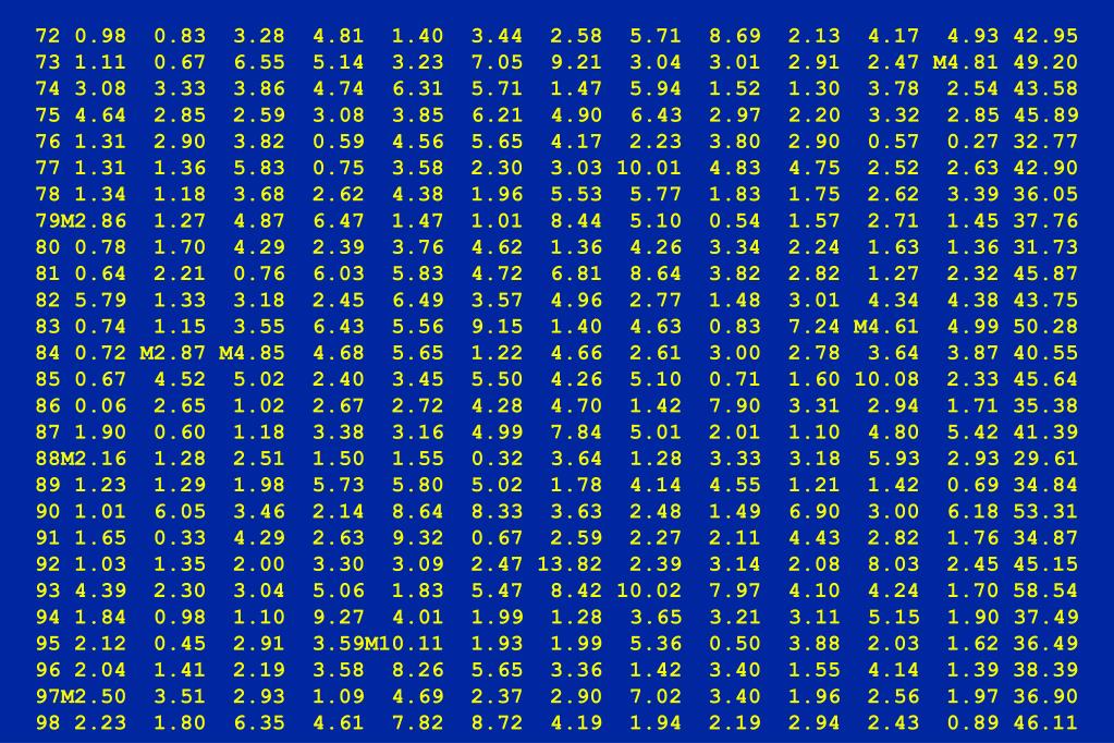 72 0.98 0.83 3.28 4.81 1.40 3.44 2.58 5.71 8.69 2.13 4.17 4.93 42.95 73 1.11 0.67 6.55 5.14 3.23 7.05 9.21 3.04 3.01 2.91 2.47 M4.81 49.20 74 3.08 3.33 3.86 4.74 6.31 5.71 1.47 5.94 1.52 1.30 3.78 2.54 43.58 75 4.64 2.85 2.59 3.08 3.85 6.21 4.90 6.43 2.97 2.20 3.32 2.85 45.89 76 1.31 2.90 3.82 0.59 4.56 5.65 4.17 2.23 3.80 2.90 0.57 0.27 32.77 77 1.31 1.36 5.83 0.75 3.58 2.30 3.03 10.01 4.83 4.75 2.52 2.63 42.90 78 1.34 1.18 3.68 2.62 4.38 1.96 5.53 5.77 1.83 1.75 2.62 3.39 36.05 79M2.86 1.27 4.87 6.47 1.47 1.01 8.44 5.10 0.54 1.57 2.71 1.45 37.76 80 0.78 1.70 4.29 2.39 3.76 4.62 1.36 4.26 3.34 2.24 1.63 1.36 31.73 81 0.64 2.21 0.76 6.03 5.83 4.72 6.81 8.64 3.82 2.82 1.27 2.32 45.87 82 5.79 1.33 3.18 2.45 6.49 3.57 4.96 2.77 1.48 3.01 4.34 4.38 43.75 83 0.74 1.15 3.55 6.43 5.56 9.15 1.40 4.63 0.83 7.24 M4.61 4.99 50.28 84 0.72 M2.87 M4.85 4.68 5.65 1.22 4.66 2.61 3.00 2.78 3.64 3.87 40.55 85 0.67 4.52 5.02 2.40 3.45 5.50 4.26 5.10 0.71 1.60 10.08 2.33 45.64 86 0.06 2.65 1.02 2.67 2.72 4.28 4.70 1.42 7.90 3.31 2.94 1.71 35.38 87 1.90 0.60 1.18 3.38 3.16 4.99 7.84 5.01 2.01 1.10 4.80 5.42 41.39 88M2.16 1.28 2.51 1.50 1.55 0.32 3.64 1.28 3.33 3.18 5.93 2.93 29.61 89 1.23 1.29 1.98 5.73 5.80 5.02 1.78 4.14 4.55 1.21 1.42 0.69 34.84 90 1.01 6.05 3.46 2.14 8.64 8.33 3.63 2.48 1.49 6.90 3.00 6.18 53.31 91 1.65 0.33 4.29 2.63 9.32 0.67 2.59 2.27 2.11 4.43 2.82 1.76 34.87 92 1.03 1.35 2.00 3.30 3.09 2.47 13.82 2.39 3.14 2.08 8.03 2.45 45.15 93 4.39 2.30 3.04 5.06 1.83 5.47 8.42 10.02 7.97 4.10 4.24 1.70 58.54 94 1.84 0.98 1.10 9.27 4.01 1.99 1.28 3.65 3.21 3.11 5.15 1.90 37.49 95 2.12 0.45 2.91 3.59M10.11 1.93 1.99 5.36 0.50 3.88 2.03 1.62 36.49 96 2.04 1.41 2.19 3.58 8.26 5.65 3.36 1.42 3.40 1.55 4.14 1.39 38.39 97M2.50 3.51 2.93 1.09 4.69 2.37 2.90 7.02 3.40 1.96 2.56 1.97 36.90 98 2.23 1.80 6.35 4.61 7.82 8.72 4.19 1.94 2.19 2.94 2.43 0.89 46.11