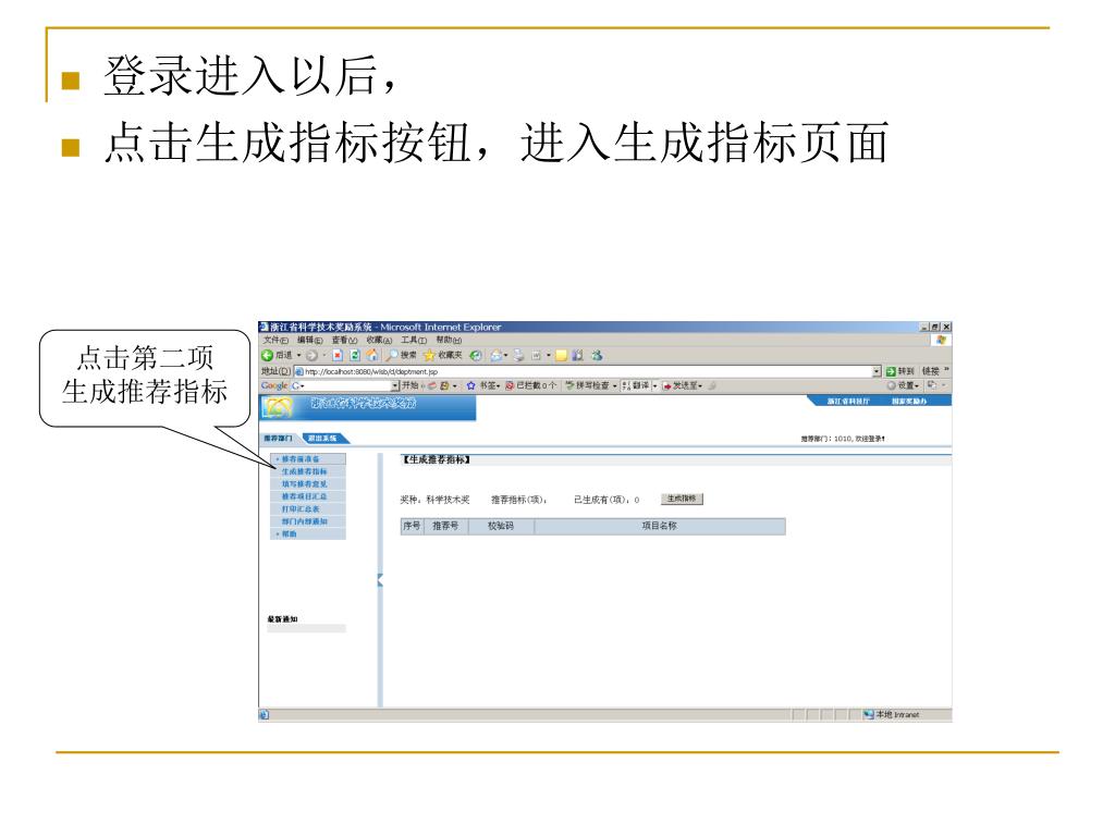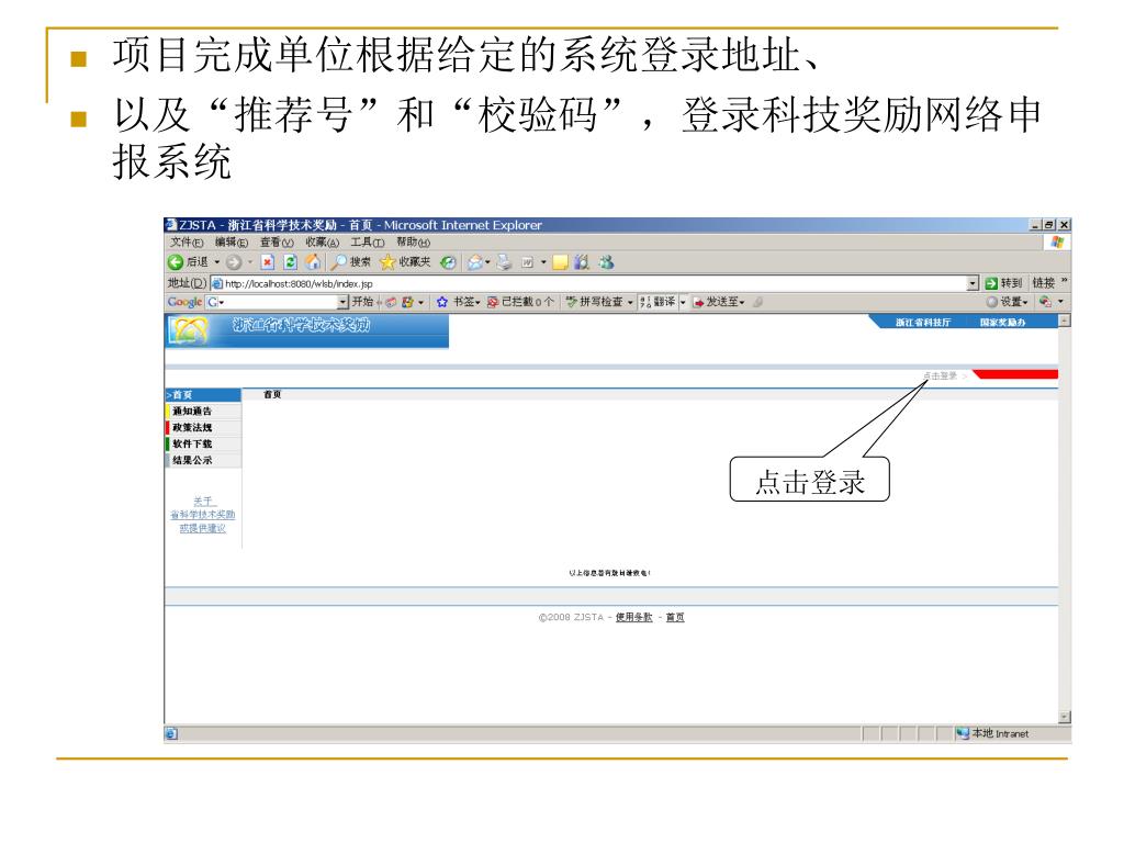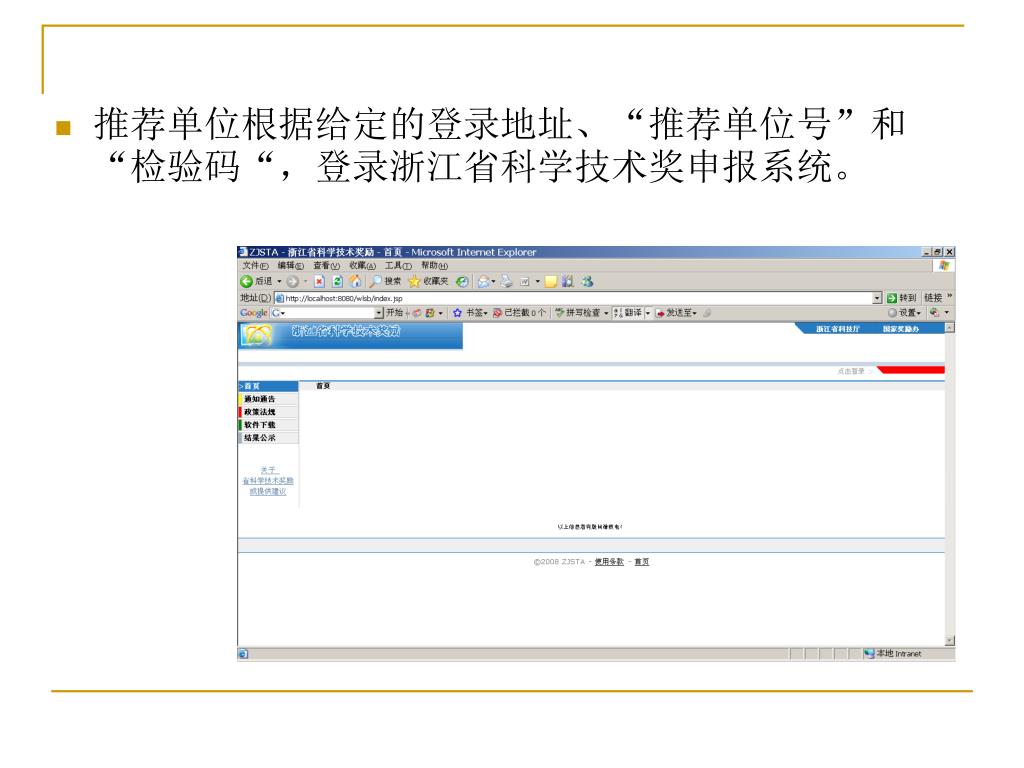 一、生成项目推荐号 • 登录项目申报系统 • 推荐单位在收到 • 浙江省科学技术厅成果处推荐通知后, • 按照推荐通知给定的申报系统网址http://sta.zjkjt.gov.cn/wlsb, • 登录”浙江省科学技术奖励”网站。