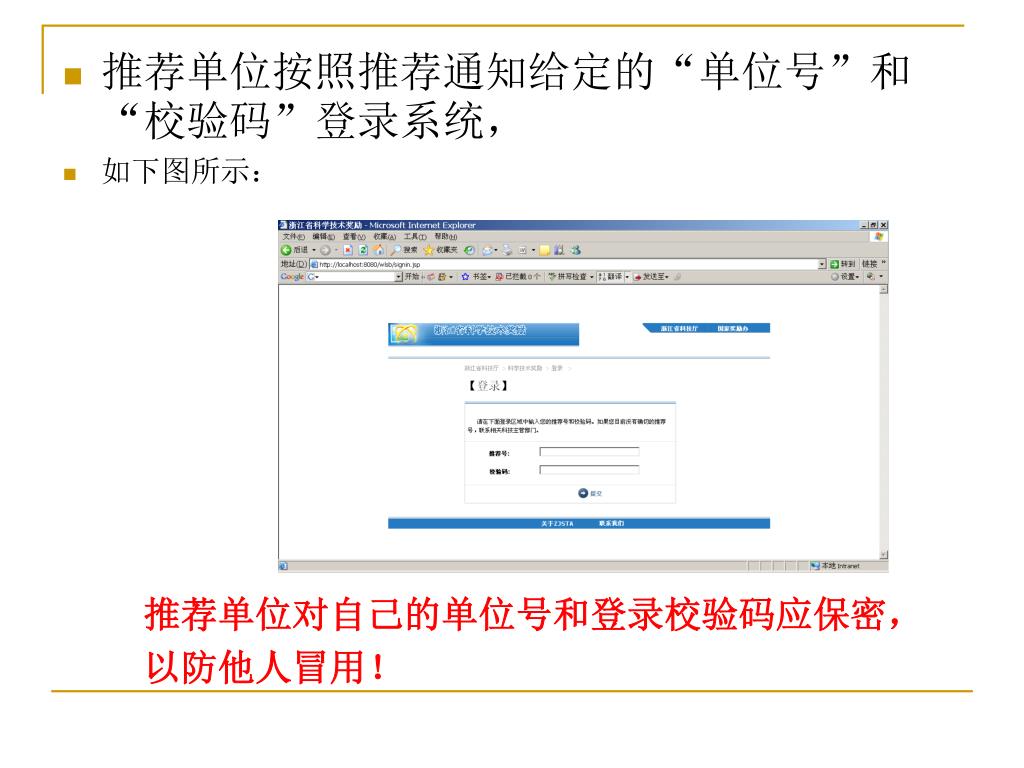 推荐单位根据给定的登录地址、“推荐单位号”和“检验码“,登录浙江省科学技术奖申报系统。推荐单位根据给定的登录地址、“推荐单位号”和“检验码“,登录浙江省科学技术奖申报系统。
