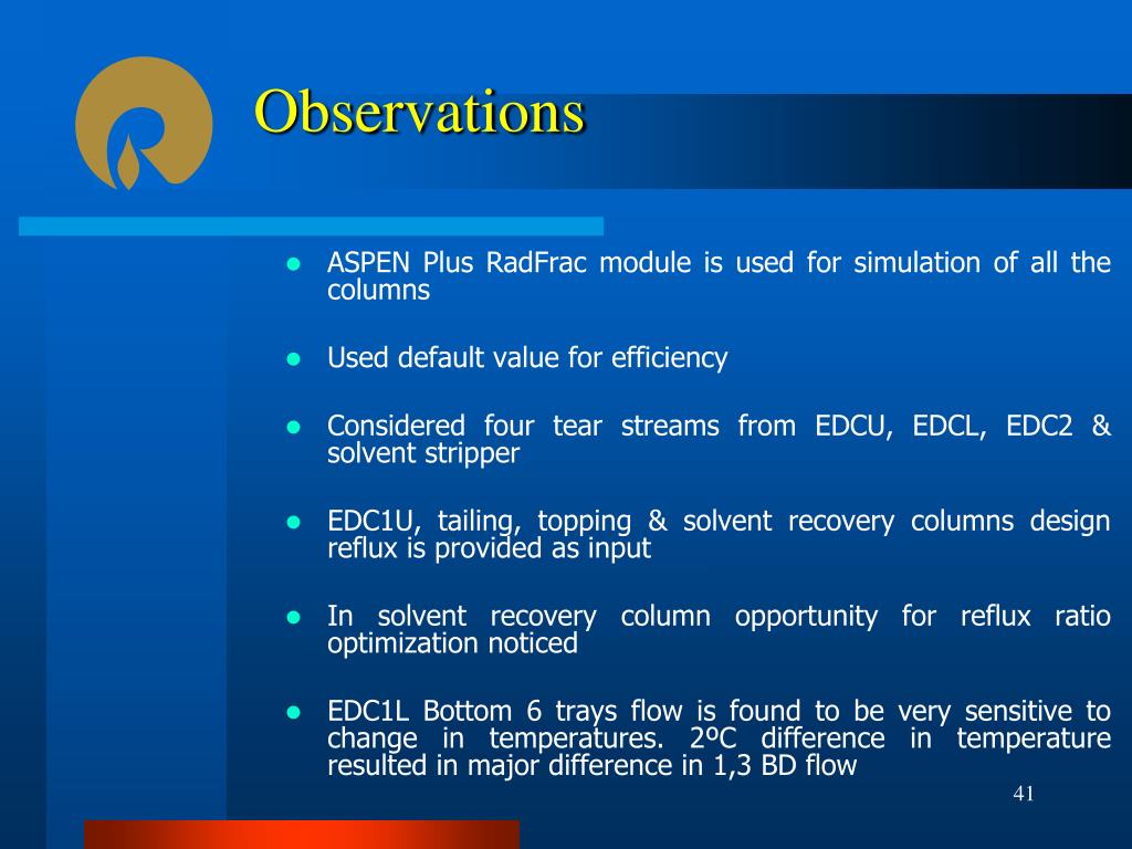Observations • ASPEN Plus RadFrac module is used for simulation of all the columns • Used default value for efficiency • Considered four tear streams from EDCU, EDCL, EDC2 & solvent stripper • EDC1U, tailing, topping & solvent recovery columns design reflux is provided as input • In solvent recovery column opportunity for reflux ratio optimization noticed • EDC1L Bottom 6 trays flow is found to be very sensitive to change in temperatures. 2ºC difference in temperature resulted in major difference in 1,3 BD flow