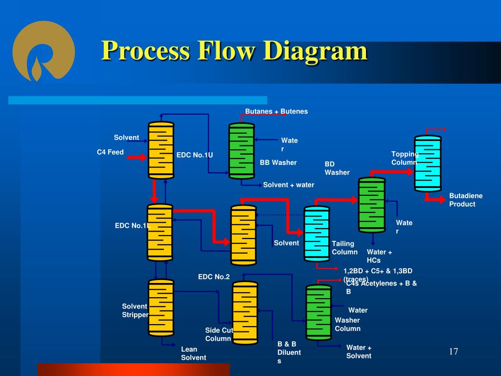 Butanes + Butenes Solvent Water Topping Column EDC No.1U C4 Feed BB Washer BD Washer Solvent + water Butadiene Product Water EDC No.1L Tailing Column Solvent Water + HCs EDC No.2 1,2BD + C5+ & 1,3BD (traces) C4s Acetylenes + B & B Solvent Stripper Water Washer Column Side Cut Column B & B Diluents Water + Solvent Lean Solvent Process Flow Diagram