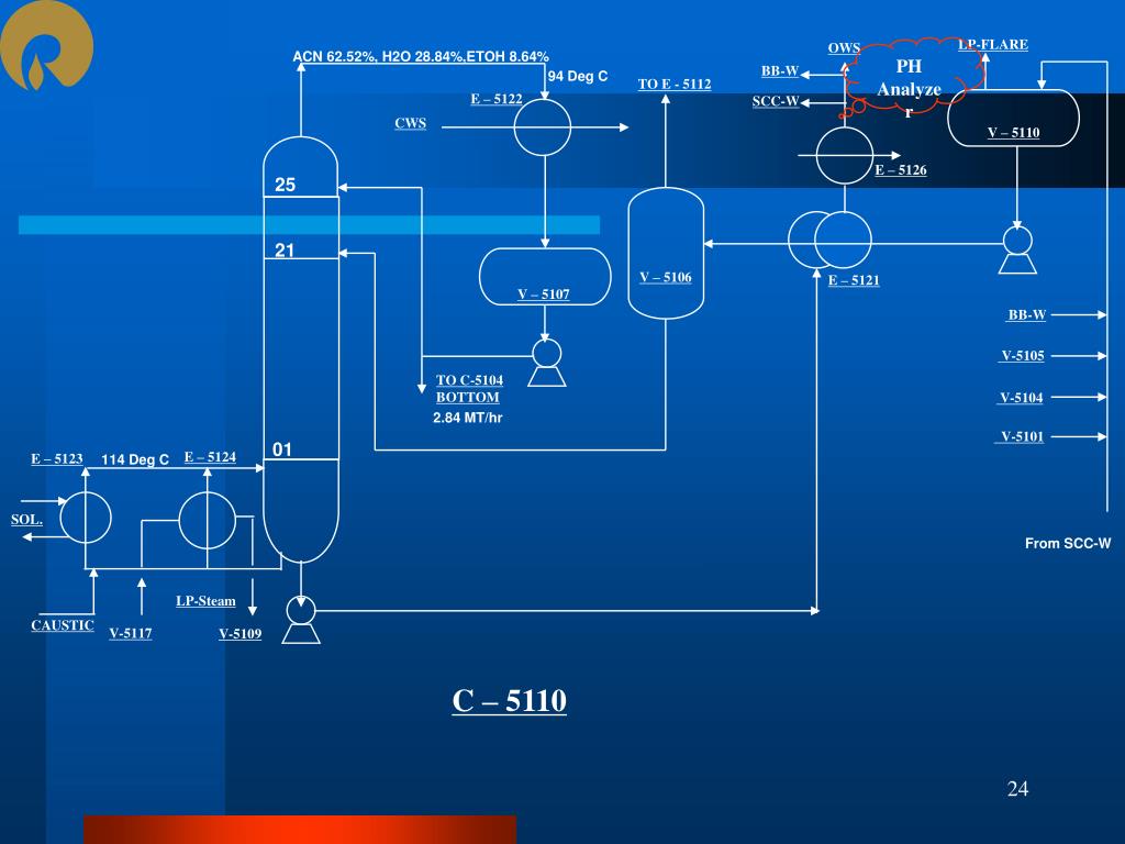 V –5106 LP-FLARE OWS PH Analyzer ACN 62.52%, H2O 28.84%,ETOH 8.64% BB-W 94 Deg C TO E - 5112 E –5122 SCC-W CWS V –5110 E –5126 E –5121 V –5107 BB-W V-5105 TO C-5104 BOTTOM V-5104 V-5101 E –5124 E –5123 114 Deg C SOL. From SCC-W LP-Steam CAUSTIC V-5117 V-5109 C –5110