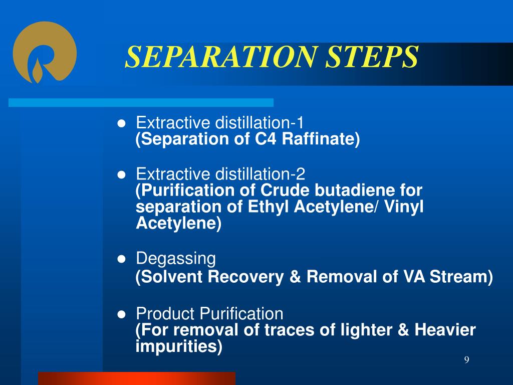 SEPARATION STEPS • Extractive distillation-1 (Separation of C4 Raffinate) • Extractive distillation-2 (Purification of Crude butadiene for separation of Ethyl Acetylene/ Vinyl Acetylene) • Degassing (Solvent Recovery & Removal of VA Stream) • Product Purification (For removal of traces of lighter & Heavier impurities)