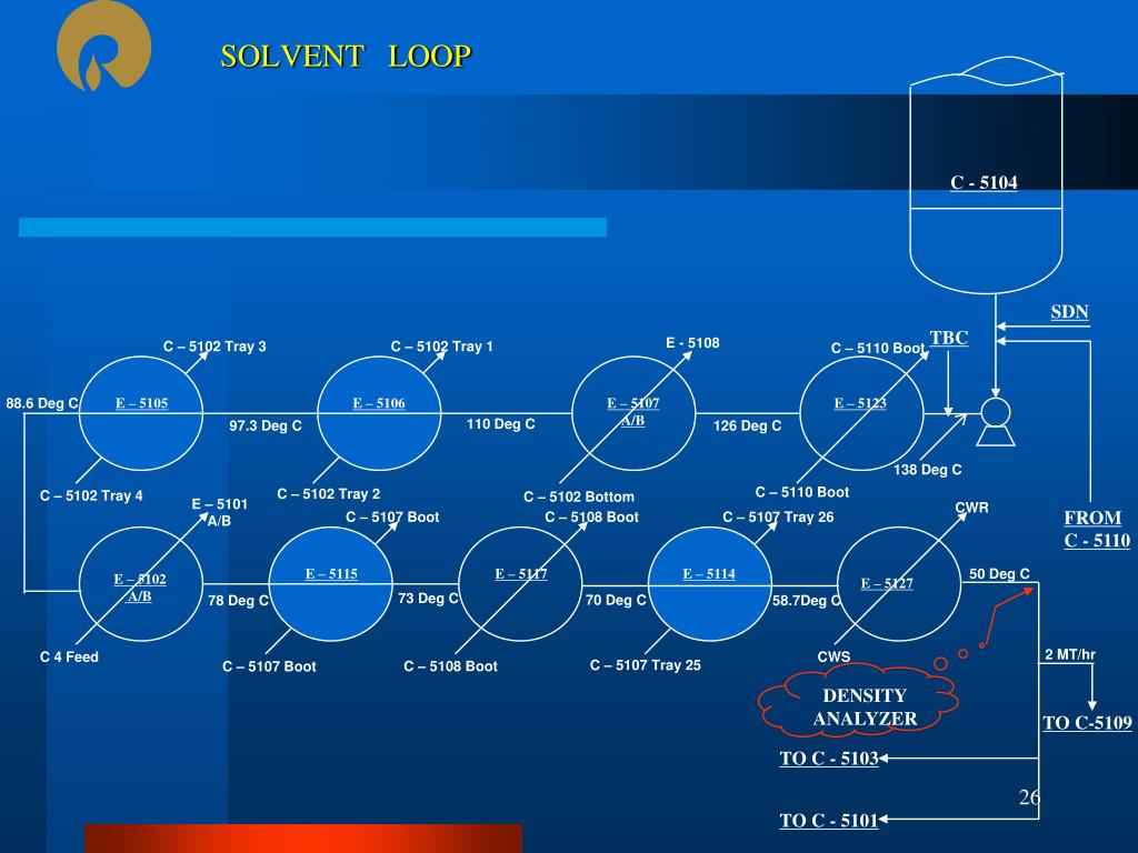 SOLVENT LOOP C - 5104 SDN TBC 88.6 Deg C E –5105 E –5106 E –5107 A/B E –5123 110 Deg C 97.3 Deg C 126 Deg C 138 Deg C FROM C - 5110 E –5115 E –5117 E –5114 50 Deg C E –5102 A/B E –5127 73 Deg C 70 Deg C 78 Deg C 58.7Deg C DENSITY ANALYZER TO C-5109 TO C - 5103 TO C - 5101