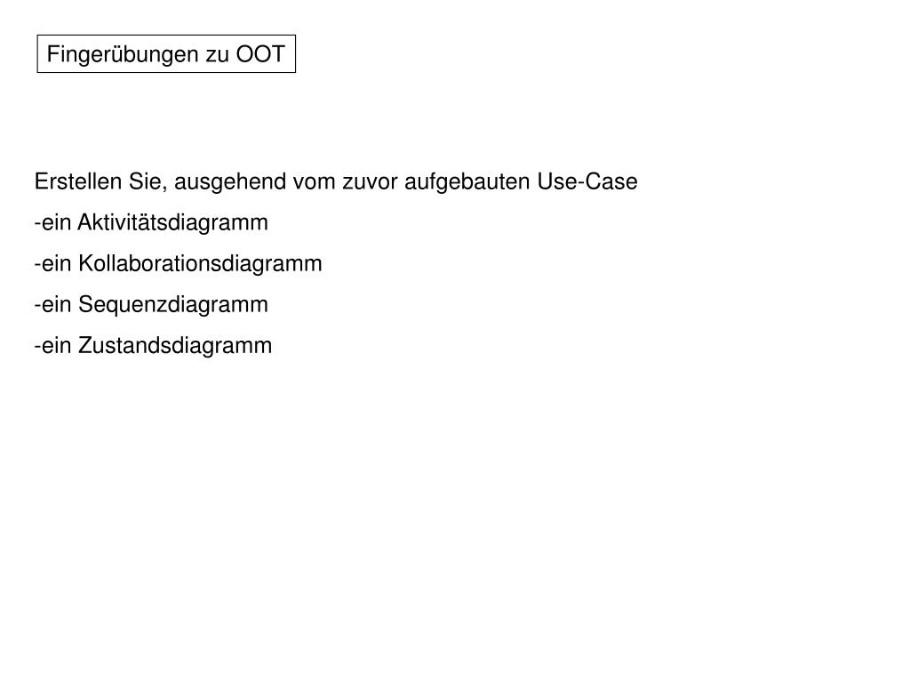 Fingerübungen zu OOT • Erstellen Sie, ausgehend vom zuvor aufgebauten Use-Case • ein Aktivitätsdiagramm • ein Kollaborationsdiagramm • ein Sequenzdiagramm • ein Zustandsdiagramm