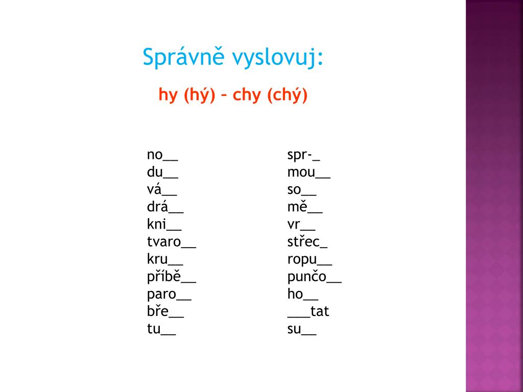 Správně vyslovuj: hy (hý) – chy (chý) no__ du__ vá__ drá__ kni__ tvaro__ kru__ příbě__ paro__ bře__ tu__ spr-_ mou__ so__ mě__ vr__ střec_ ropu__ punčo__ ho__ ___tat su__