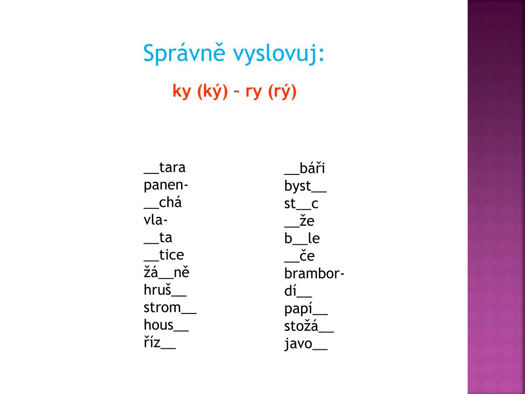 Správně vyslovuj: ky (ký) – ry (rý) __tara panen- __chá vla- __ta __tice žá__ně hruš__ strom__ hous__ říz__ __báři byst__ st__c __že b__le __če brambor- dí__ papí__ stožá__ javo__