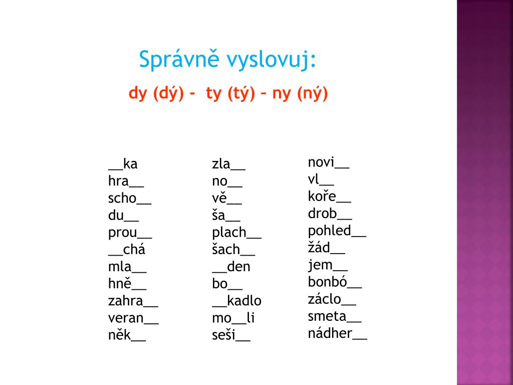 Správně vyslovuj: dy (dý) - ty (tý) – ny (ný) novi__ vl__ koře__ drob__ pohled__ žád__ jem__ bonbó__ záclo__ smeta__ nádher__ __ka hra__ scho__ du__ prou__ __chá mla__ hně__ zahra__ veran__ něk__ zla__ no__ vě__ ša__ plach__ šach__ __den bo__ __kadlo mo__li seši__