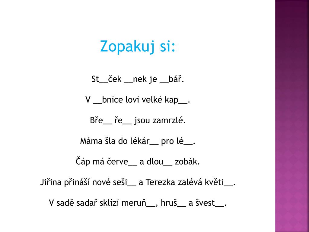 Zopakuj si: St__ček __nek je __bář. V __bníce loví velké kap__. Bře__ ře__ jsou zamrzlé. Máma šla do lékár__ pro lé__. Čáp má červe__ a dlou__ zobák. Jiřina přináší nové seši__ a Terezka zalévá květi__. V sadě sadař sklízí meruň__, hruš__ a švest__.
