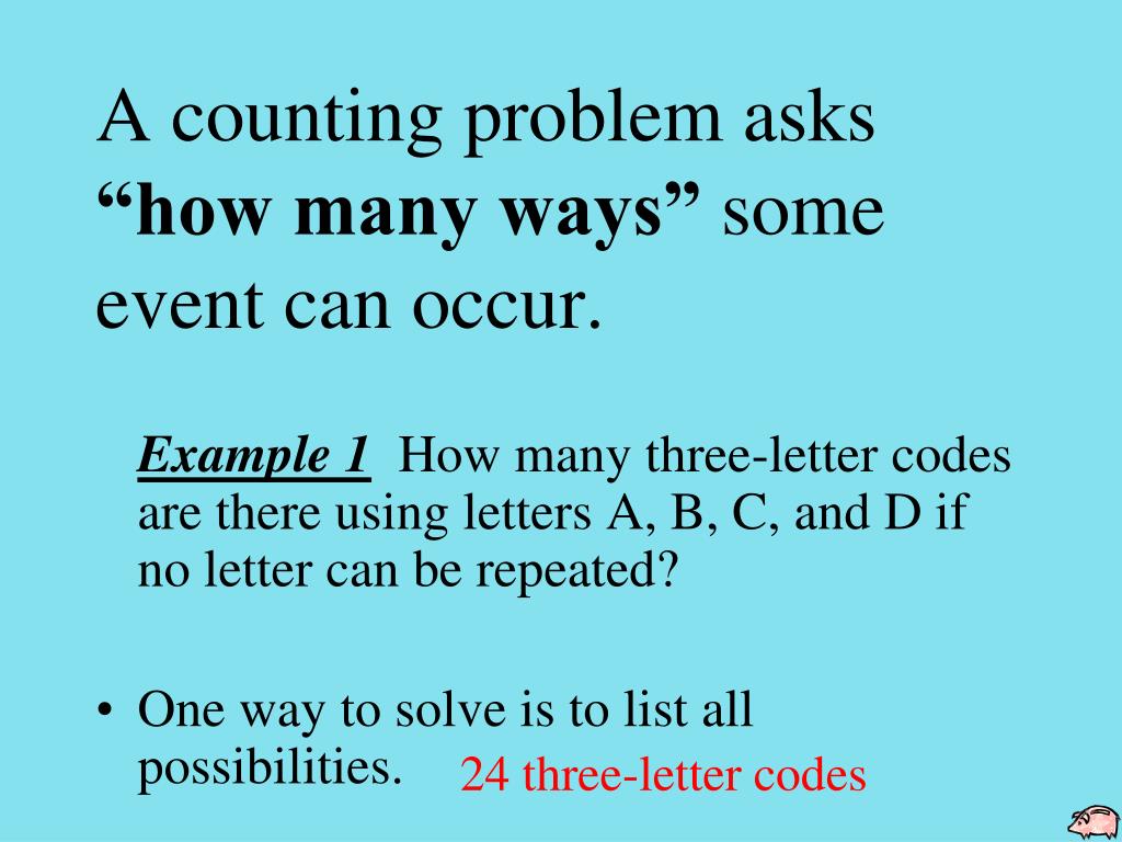 A counting problem asks “how many ways” some event can occur. Example 1How many three-letter codes are there using letters A, B, C, and D if no letter can be repeated? One way to solve is to list all possibilities. 24 three-letter codes