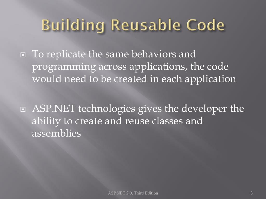 Building Reusable Code • To replicate the same behaviors and programming across applications, the code would need to be created in each application • ASP.NET technologies gives the developer the ability to create and reuse classes and assemblies ASP.NET 2.0, Third Edition