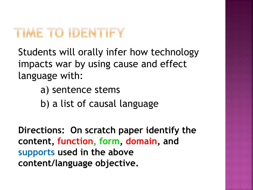 Time to identify Students will orally infer how technology impacts war by using cause and effect language with: a) sentence stems b) a list of causal language Directions: On scratch paper identify the content, function, form, domain, and supports used in the above content/language objective.
