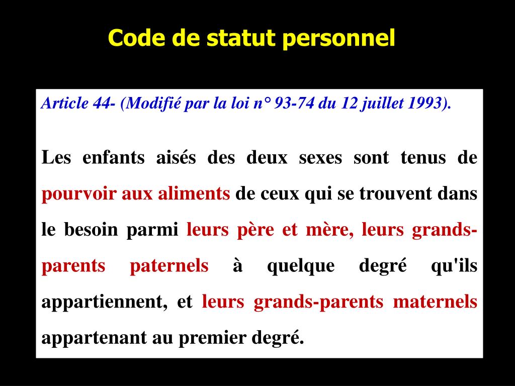 Code de statut personnel Article 44- (Modifié par la loi n° 93-74 du 12 juillet 1993). Les enfants aisés des deux sexes sont tenus de pourvoir aux aliments de ceux qui se trouvent dans le besoin parmi leurs père et mère, leurs grands-parents paternels à quelque degré qu'ils appartiennent, et leurs grands-parents maternels appartenant au premier degré.